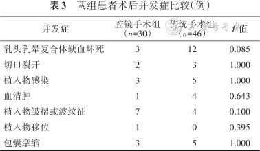 腔镜手术组和传统手术组分别有3例和12例患者出现乳头乳晕复合体缺血坏死,差异无统计学意义(P>0.05)。其中腔镜手术组有1例为4级缺血坏死,传统手术组有1例为3级缺血坏死,两组其余病例缺血坏死等级均为1级。两组分别有2例和3例患者出现切口裂开(P>0.05)。每组各有1例应患者要求取出假体,传统手术组中有1例患者因切口裂开导致假体外露后出现假体感染,经清创缝合后感染控制、切口愈合。两组患者中出现假体感染的概率均约为10%(P>0.05)。各有1例患者因此行假体取出术,其余病例均接受保守治疗或清创缝合后感染控制。腔镜手术组7例患者(23.3%)出现植入物皱褶或波纹征的概率较传统手术组4例(8.7%)高,但差异无统计学意义(P>0.05)。腔镜手术组中1例出现植入物移位,而传统手术组未出现此并发症。两组各约有10%的患者出现包囊挛缩(P>0.05),见表3。其中腔镜手术组和传统手术组各有1例和2例此并发症出现在放疗后。除此之外,传统手术组中有2例包囊挛缩患者曾出现假体感染。两组患者在术后并发症发生率上差异均无统计学意义(均P>0.05),见表3。两组患者均未出现术后活动性出血、植入物破裂、植入物转位和植入物相关的间变性大细胞淋巴瘤等并发症。