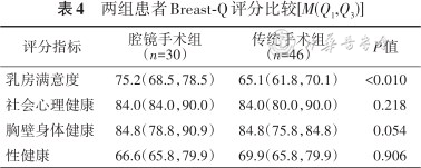 | 乳房满意度 | 75.2(68.5,78.5) | 65.1(61.8,70.1) | <0.010 |