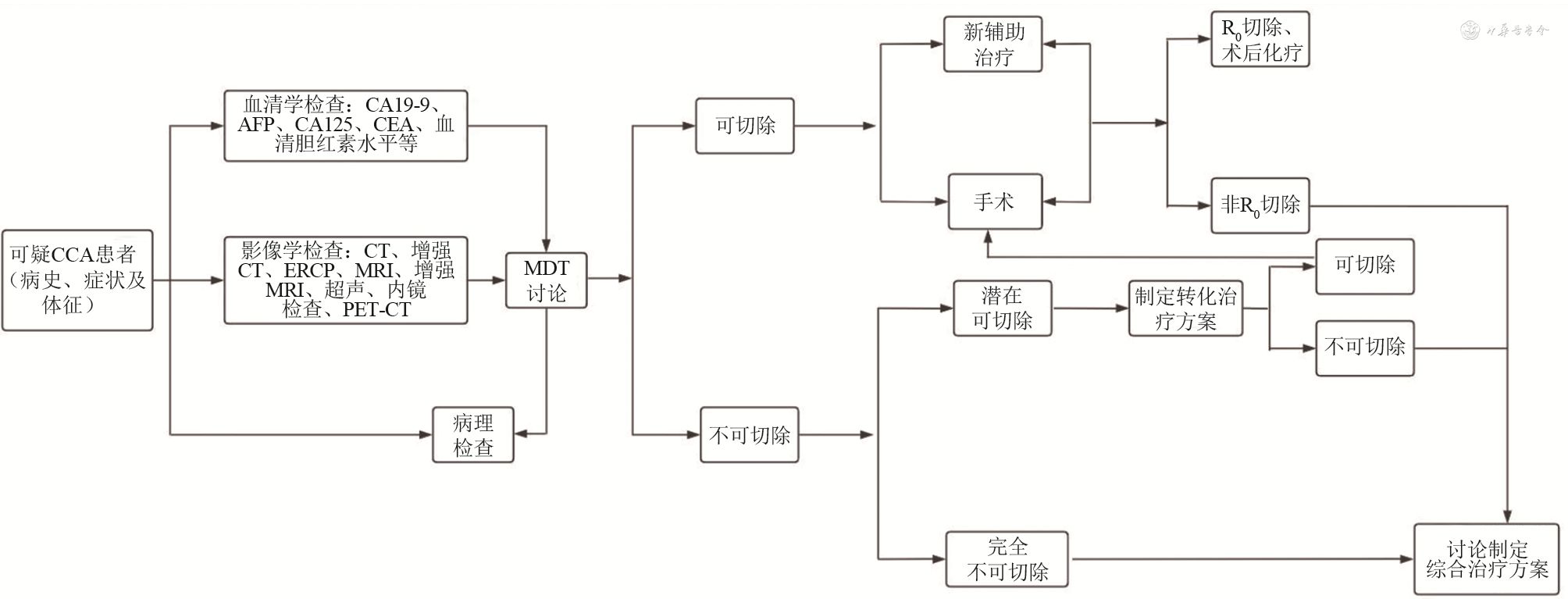 目前CCA患者的首选治疗方法仍是外科手术,但因CCA早期诊断困难,恶性程度较高且易复发转移,对外科医师选择合适的手术时机及术式具有极大的挑战。《指南》建议CCA患者的管理应在综合医院内进行,手术时机选择及手术方式等应由专业的MDT团队制订。同时提出,对于不能明确排除恶性肿瘤的患者可采取积极的手术治疗,因为手术可以解除患者部分症状并且能为诊断提供帮助。对于腹腔镜分期(staging laparoscopy,SL)的应用,《指南》中未提出明确建议。