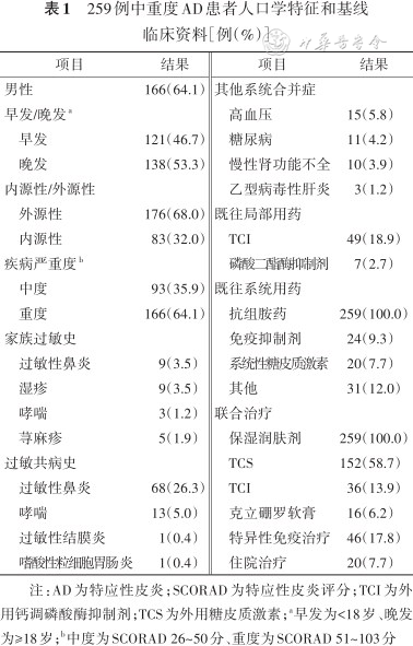 259例患者的年龄为(35.4±25.9)岁,AD病程为4.00(2.00,9.00)年,BMI为(20.75±4.29)kg/m²;其中,男性比例(64.1%,166例)高于女性(35.9%,93例),外源性患者比例(68.0%,176例)高于内源性患者(32.0%,83例),家族过敏史和过敏共病史中以过敏性鼻炎(3.5%,9例)最常见。见表1。中度AD患者为92例,重度AD患者为167例,重度AD患者在治疗期间联合使用外用糖皮质激素的比例(62.3%,104例)高于中度AD患者(47.8%,44例)(χ²=5.06,P=0.025),其他临床特征差异均无统计学意义(均P>0.05)。