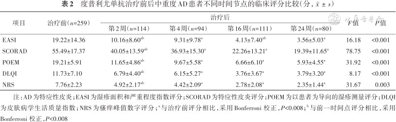 注:AD为特应性皮炎;EASI为湿疹面积和严重程度指数评分;SCORAD为特应性皮炎评分;POEM为以患者为导向的湿疹测量评分;DLQI为皮肤病学生活质量指数;NRS为瘙痒峰值数字评分;a与治疗前评分相比,采用Bonferroni 校正,P<0.008;b与前一时间点评分相比,采用Bonferroni 校正,P<0.008