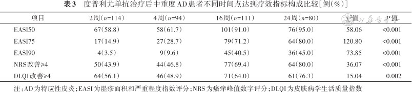 1. 度普利尤单抗治疗后各项评分变化:治疗后第2、4、16、24周EASI、SCORAD、POEM、DLQI和NRS评分与治疗前相比均降低(均P<0.01)。治疗后第2、16周的EASI评分与前一时间点相比均降低(P<0.008)(表2)。达到主要和次要疗效指标的比例见表3,其中,中度和重度AD患者在各时间点的各疗效指标构成差异无统计学意义(P>0.05)。