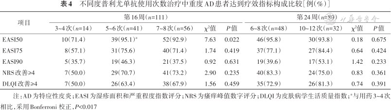 2. 用药次数对疗效的影响:随访期间,因时间及经济成本原因,部分患者未严格依从2周间隔时间治疗。治疗16周时,只接受3~4次治疗患者的EASI50比例低于接受5~6次治疗(P=0.014)的患者,但其他疗效指标比例差异无统计学意义(均P>0.017)。治疗24周时不同用药次数的疗效指标比例差异无统计学意义(均P>0.05)(表4)。