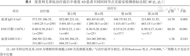 3. 度普利尤单抗治疗后相关实验室指标的变化:度普利尤单抗治疗后,血清总IgE水平、EOS和血清LDH水平均存在波动(表5),第24周的总IgE水平与治疗前相比显著降低(P=0.005);第16周(P=0.005)和第24周(P<0.001)的EOS计数与治疗前相比降低。LDH水平在治疗前后差异无统计学意义。