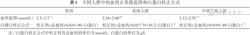 血钙在体内波动范围小,受甲状旁腺素(PTH)、维生素D(VitD)和降钙素的严格调控。其正常范围一般处于2.12~2.62 mmol/L[2],我国《骨转换生化标志物临床应用指南》[3](以下简称指南)中为2.2~2.7 mmol/L。离子钙的正常范围一般为1.0~1.4 mmol/L[4],指南中为(1.18±0.05)mmol/L[3]。由于血钙浓度受白蛋白影响,需计算白蛋白校正血钙。但是对于该公式的普适性以及不同人种是否需要采用不同的血钙正常范围和不同的白蛋白校正公式,学术界进行了探讨,提出了略有别于以往的校正公式[5, 6](表1)。