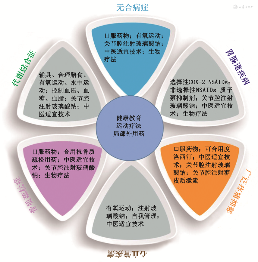 针对EKOA患者,可以根据其个体情况提供个性化治疗方案,这已成为当前EKOA治疗的趋势之一。考虑到患者病情的复杂性和可合并多种其他疾病,治疗方案应根据不同个体的特征进行调整(图3)。合并胃肠道疾病的EKOA患者,可以优先考虑外用药或局部关节腔注射等治疗措施,若疗效不佳,则可口服选择性NSAIDs或非选择性NSAIDs联合质子泵抑制剂药物。存在广泛疼痛或合并焦虑的EKOA患者,可视情况适当使用抗焦虑药物[153]。合并心血管疾病的患者,可首先考虑局部外用药或关节腔注射玻璃酸钠等治疗措施。合并骨质疏松症的患者,应在相应治疗的基础上结合抗骨质疏松症药物,以取得更好的疗效。合并代谢综合征的EKOA患者,可采取针对性的减重治疗,控制血糖、血压,合理膳食、有氧运动、使用辅助支具如减压支具等。
