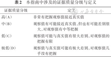 依据WHO指南制订指导手册专家推荐意见分级评估、制订及评价(Grading of Recommendations Assessment,Development and Evaluation,GRADE)方法(http://www.grade-workinggroup.org/)对证据体的证据质量和推荐意见的推荐强度进行分级(表1、2),其中推荐强度根据专家咨询意见增加了“专家共识(GPS)”强度,是指基于非直接证据或专家意见、经验形成的推荐。