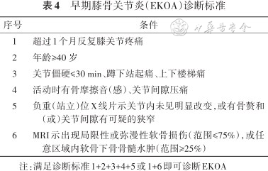 本指南提出的EKOA诊断标准参考美国风湿病学会(ACR)标准[20]、欧洲抗风湿联盟(EULAR)诊断建议[21]、日本EKOA学会[22]及国际骨关节炎研究学会(OARSI)的影像学研究[23],具体见表4。