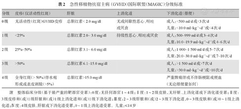 急性GVHD的严重程度分度标准是根据急性GVHD对移植后非复发相关死亡的影响程度制定的,采用皮肤、胃肠道和肝脏急性GVHD分别积分后再形成总的分度。主要有三种分度标准,其中临床最常采用改良Glucksberg标准(表1),近年来急性GVHD国际联盟(MAGIC)分级标准应用有增多趋势(表2)[1,46],此外还有IBMTR分级系统[47,48]。