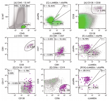 (1)检测MRD的抗体选择:CD38和CD138通常用来界定浆细胞群体。所有浆细胞均高表达CD38,但除浆细胞外,CD38在正常B祖细胞、造血祖细胞和成熟单核细胞高表达,在成熟的粒细胞、活化T细胞也有低密度表达,因此仅用CD38设门会造成误差,敏感性强,特异性差,有效率低,不建议单独使用。CD138常表达于浆细胞和一些肿瘤细胞,单独设门圈定浆细胞适用于CD138表达阳性的患者,特异性强,但敏感性低。采用CD38/CD138/CD45设门,联合CD19和CD56可以区分大多数正常和异常浆细胞,浆细胞肿瘤的"骨架"抗体应包含CD38/CD138/CD19/CD56/CD45。正常浆细胞群体CD38(bri)CD138(bri)且非限制性表达胞质免疫球蛋白kappa(Cytosolic immunoglobulin Kappa, cyκ)或lambda(cyλ)轻链(如图1灰色细胞群)。大部分正常浆细胞为CD19(+)CD56(-)CD45(+)CD20(-)CD27(+)CD28(-)CD81(+)CD117(-),符合典型的浆细胞免疫表型特征;小部分正常浆细胞(低于总浆细胞群体的30%)可以为CD19(-)或CD56(+)或CD45(-/low)或CD20(+)或CD27(low),这些非典型的免疫表型一般不会同时出现,最重要的是cyκ/cyλ为非限制性表达。异常浆细胞的免疫表型可以表现为CD38、CD19、CD45、CD27、CD81、CD20、CD28、CD56、CD117的异常表达,且限制性表达轻链cyκ或cyλ(如图1紫色细胞群)。胞质免疫球蛋白轻链的限制性表达是确定浆细胞克隆性最直接的证据,在使用抗体较少时,建议将这两种抗体也纳入骨架抗体中。异常浆细胞还可以表达CD13、CD33等交叉抗原,可视仪器配置情况酌情选用。值得注意的是,部分MM患者治疗后可能出现CD138/CD38的下调甚至转为阴性,初步设门圈定浆细胞群体时要注意结合其他标志。