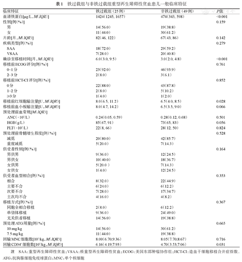 铁过载组与非铁过载组重型再生障碍性贫血患儿一般临床特征
