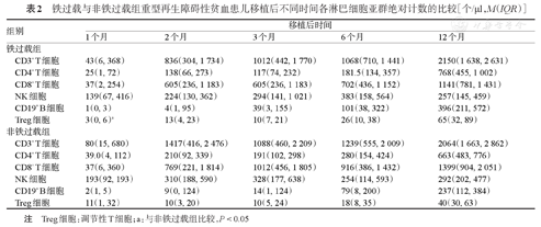 与非铁过载组相比,铁过载组患儿在移植后第1个月Treg细胞数量明显减少[3(0,6)个/μl对11(1,32)个/μl,P=0.045]。两组CD3+ T、CD4+ T、CD8+ T、CD19+ B和NK细胞数量在移植后第1、2、3、6、12个月差异均无统计学意义(均P>0.05)(表2)。