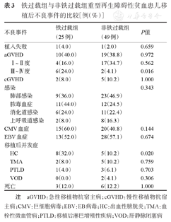 铁过载组与非铁过载组重型再生障碍性贫血患儿移植后不良事件的比较[例(%)]