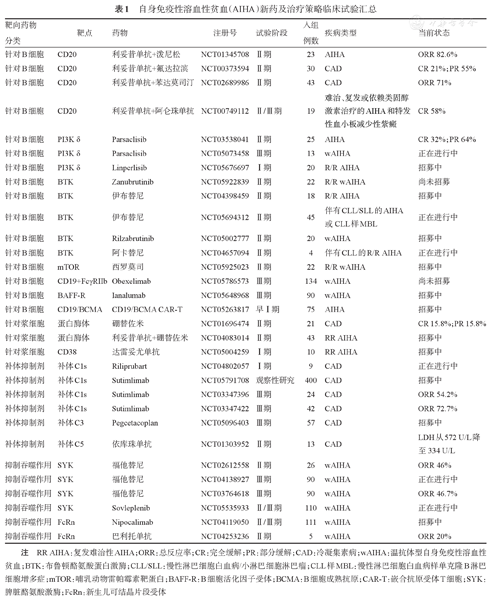 注 RR AIHA:复发难治性AIHA;ORR:总反应率;CR:完全缓解;PR:部分缓解;CAD:冷凝集素病;wAIHA:温抗体型自身免疫性溶血性贫血;BTK:布鲁顿酪氨酸蛋白激酶;CLL/SLL:慢性淋巴细胞白血病/小淋巴细胞淋巴瘤;CLL样MBL:慢性淋巴细胞白血病样单克隆B淋巴细胞增多症;mTOR:哺乳动物雷帕霉素靶蛋白;BAFF-R:B细胞活化因子受体;BCMA:B细胞成熟抗原;CAR-T:嵌合抗原受体T细胞;SYK:脾脏酪氨酸激酶;FcRn:新生儿可结晶片段受体