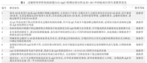 | 1 | 建议AD患者进行血清sIgE检测以明确过敏诱因,尤其是以下患者:①既往发生过速发型变态反应的AD患者;②中重度AD患者,尤其是规范化治疗效果欠佳者;③有家族过敏史的AD患者;④同时患有哮喘、过敏性鼻炎、过敏性结膜炎、食物过敏等合并症的AD患者 | 强推荐 |