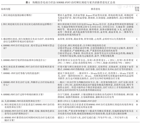 海姆泊芬光动力疗法(HMME-PDT)治疗鲜红斑痣专家共识推荐意见汇总表