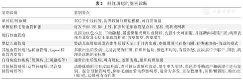 推荐意见1:鲜红斑痣的鉴别诊断有血管肿瘤(婴幼儿血管瘤、丛状血管瘤、Kaposi样血管内皮瘤等)、其他毛细血管畸形(单纯痣/鲑鱼斑、单侧痣样毛细血管扩张、匍行性血管瘤等)、自身免疫性疾病(硬斑病、红斑狼疮等)、其他脉管畸形(动静脉畸形、混合型脉管畸形等)。证据等级C。鉴别要点见表2。