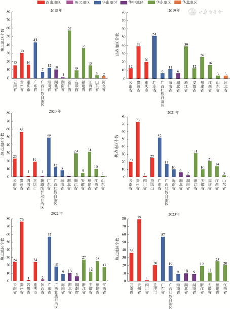 (2)局部空间自相关分析:2018-2023年热点地区数量分别为256、244、246、284、308和315个,其中热点地区数量居前5位的省份分别为贵州省(353个)、广东省(309个)、浙江省(202个)、福建省(164个)和云南省(130个)。2018-2023年热点地区的最高发病率分别为90.51/10万、91.81/10万、66.56/10万、53.85/10万、49.39/10万和61.19/10万;发病率中位数分别为17.17/10万、16.74/10万、15.86/10万、16.62/10万、15.78/10万和15.61/10万。热点地区主要集中在东南沿海和西南地区,包括浙江省、福建省、广东省、贵州省、云南省和重庆市。冷点地区主要集中在东北、西北和西南地区,包括黑龙江省、吉林省、辽宁省、新疆维吾尔自治区和西藏自治区。见图1。