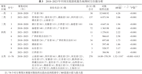 3. 时空扫描分析:共识别出76个时空聚集区有统计学意义,覆盖25个省(自治区、直辖市)。使用自然断点法,根据LLR值将聚集区分为5个类别。一类聚集区为2018-2020年的广东省,包括38个县(区);二类聚集区为2021-2023的贵州省、重庆市、湖南省、四川省、湖北省和云南省,共137个县(区);三类聚集区由第3~4时空聚集区组成,为2018-2020年的浙江省、福建省、安徽省、江西省和广东省,共188个县(区);四类聚集区由第5~10时空聚集区组成,为2018-2023年的安徽省、广西壮族自治区、海南省、广东省、湖南省、山东省和江西省,共69个县(区);五类聚集区分布于19个省(自治区、直辖市),共270个县(区)。见表3。