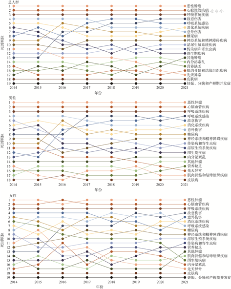 3. 死因别特征及变化趋势:2014-2021年深圳市户籍人口前3位死因顺位均为恶性肿瘤、心脑血管疾病和呼吸系统疾病,累计占全死因的构成比在72.79%~76.40%,其中前2位死因累计占全死因的构成比在65.24%~71.33%;恶性肿瘤粗死亡率从2014年的44.80/10万上升至2021年的49.59/10万(AAPC=2.59%,P=0.261),心脑血管疾病粗死亡率从2014年的29.53/10万上升至2021年的47.95/10万(AAPC=7.75%,P=0.064),呼吸系统疾病粗死亡率从2014年的7.94/10万下降至2021年的7.90/10万(AAPC=-1.21%,P=0.625);呼吸系统感染、神经系统和精神障碍疾病、故意伤害粗死亡率呈上升趋势(均P<0.05);传染病和寄生虫病、围生期疾病和先天异常粗死亡率呈下降趋势(均P<0.05)。见表3。故意伤害死因顺位上升幅度最大,从2014年的第13位上升至2021年的第4位,围生期疾病死因顺位下降幅度最大,从2014年的第6位下降至2021年的第12位。男性和女性排名前5位的死因顺位略有不同。男性2014年依次为恶性肿瘤、心脑血管疾病、呼吸系统疾病、意外伤害、传染病和寄生虫病,2021年依次为恶性肿瘤、心脑血管疾病、呼吸系统疾病、呼吸系统感染、故意伤害;女性2014年依次为恶性肿瘤、心脑血管疾病、呼吸系统疾病、意外伤害、糖尿病,2021年依次为心脑血管疾病、恶性肿瘤、呼吸系统感染、故意伤害、意外伤害。见图1。