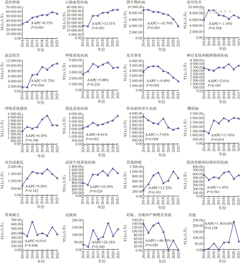 4. YLL及变化趋势:2014-2021年深圳市户籍人口YLL共计1 003 287.43人年;总人群、男性和女性YLL均呈上升趋势(均P<0.001),男性均高于女性,变化趋势与女性基本一致;2014-2021年,YLL率呈略微上升趋势,差异无统计学意义(AAPC=0.21%,P=0.924);标化YLL率呈波动上升趋势(AAPC=4.53%,P=0.022)。见表4。YLL排名前3位的疾病分别为恶性肿瘤、心脑血管疾病和围生期疾病,2014-2021年累计分别损失了386 939.32人年(38.57%)、229 125.76人年(22.84%)和60 732.38人年(6.05%);2014-2021年恶性肿瘤、心脑血管疾病、故意伤害、消化系统疾病、糖尿病、泌尿生殖系统疾病、皮肤病YLL呈上升趋势(均P<0.05),围生期疾病、先天异常、传染病和寄生虫病YLL呈下降趋势(均P<0.05),其中围生期疾病YLL平均每年下降10.79%(P<0.001),先天异常YLL平均每年下降9.49%(P=0.002),传染病和寄生虫病YLL平均每年下降7.93%(P=0.008)。见图2。