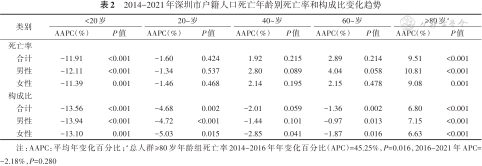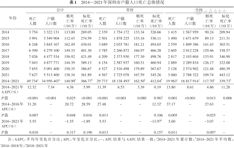基于死因监测数据描述2014-2021年深圳市户籍人口及不同亚组中的死亡率、死因顺位及早死寿命损失年(YLL),以第七次全国人口普查数据作为标准人口计算标化率,采用Joinpoint对数线性回归模型描述死亡负担变化趋势。