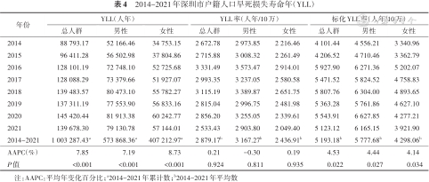 2014-2021年深圳市户籍人口早死损失寿命年(YLL)