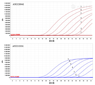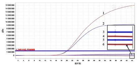 注:1:ATCC29342(FAM);2:ATCC15531(VIC);3:ATCC29342(VIC);4:ATCC15531(FAM);5:无模板阴性对照(VIC);6:无模板阴性对照(FAM)