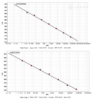将ATCC29342和ATCC15531纯菌提取核酸,使用Qubit仪器测定核酸浓度,用无核酸水将两种基因型Mp核酸分别定量为106拷贝/μl。然后进行10倍梯度稀释,累计稀释7个梯度。分别以106~1.0拷贝/μl为模板,建立分型检测方法标准曲线,确定最小检出量的拷贝数。