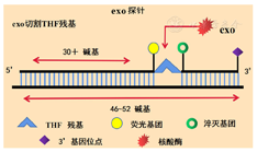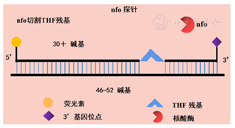 RPA技术涉及到的几种主流探针包括:exo荧光探针、fpg荧光探针和nfo荧光探针。其中,exo探针中一般含有1个四氢呋喃(tetrahydrofuran residue,THF)残基,其两侧分别为荧光基团和淬灭基团。一般情况下,exo探针长度为46~52碱基,THF残基的位置距离探针的5′端至少30碱基,距离探针的3′端至少15碱基。探针3′末端通过适当的修饰被封闭,以阻止聚合酶的进一步延伸。在合成双链DNA时,THF残基作为ExonucleaseⅢ的底物,被探针在THF残基的位置切割,使得荧光基团和淬灭基团分开,从而产生荧光信号[16,17](图4)。