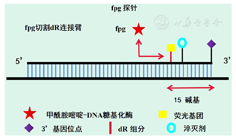 fpg探针法需要在RPA技术的基础上,加入甲酰胺嘧啶-DNA糖基化酶及fpg荧光探针,fpg荧光探针添加了4个修饰,分别为荧光基团、dR连接臂修饰、淬灭基团和3′端封闭基团,fpg酶会对dR连接臂(dR group,脱氧核糖核苷酸中的碱基被荧光基团替换,荧光基团与五碳糖通过C-O-C的结构相连,合成探针时可加入此修饰)位点进行特异性识别并切割,荧光基团从探针上分离,从而远离淬灭基团,即可发出荧光信号,然后通过检测仪器来实时监控荧光值的变化[18](图6)。