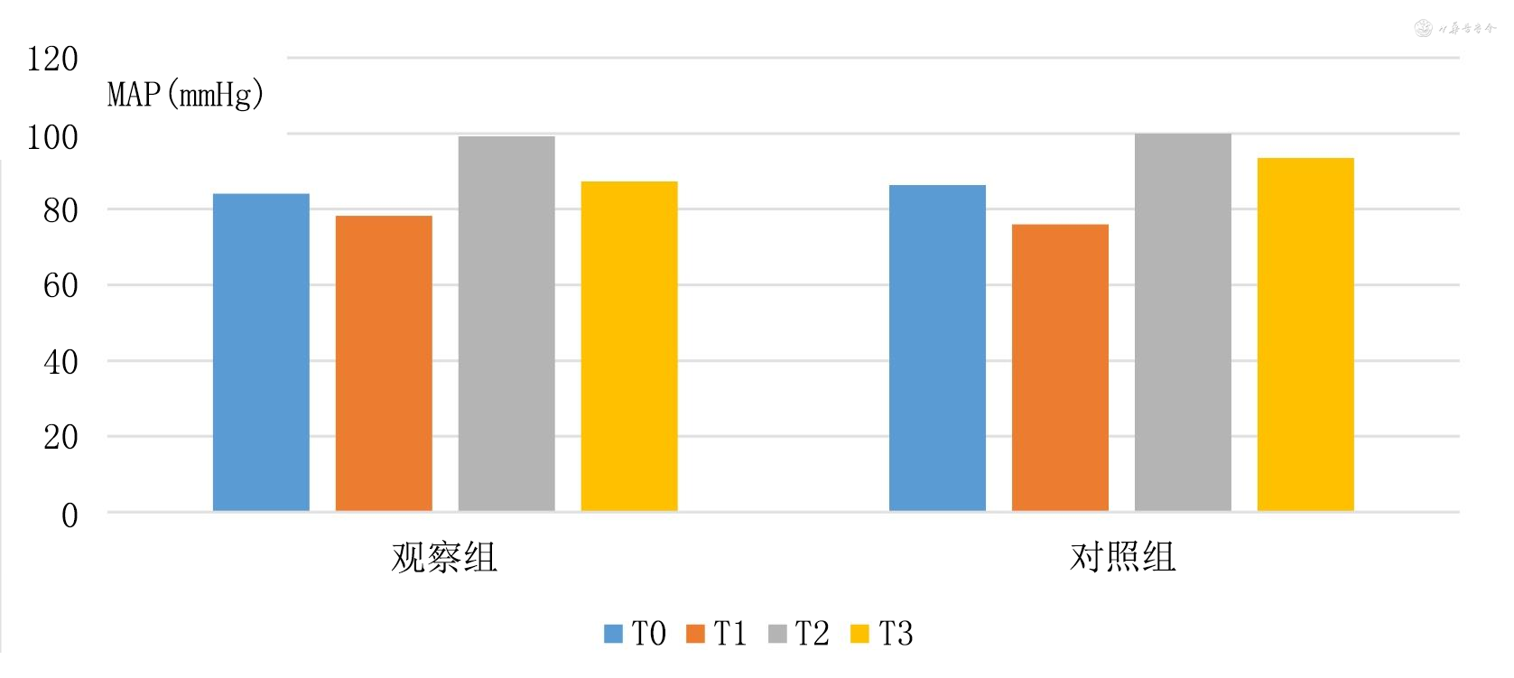 与T0相比,两组患者T1时MAP均降低(均P < 0.05),T2、T3均升高(均P < 0.05),T1、T2、T3与T0时MAP的差异均有统计学意义(均P < 0.05)(见表2)。而应用两组各时间点MAP的估算平均值柱状图可以直观看出观察组的T0到T1时波动小于对照组T0至T1时的波动,而T2到T3时波动差对照组小于观察组。见图1。