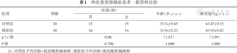 共纳入患者60例,分为两组,均完成MECT治疗,一般情况包括年龄、体质量、性别。两组一般资料差异均无统计学意义(均P > 0.05)。见表1。