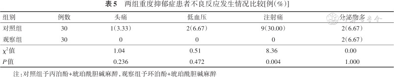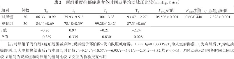 纳入标准:(1)符合重度抑郁症诊断。(2)均行MECT。排除标准:(1)对环泊酚或其他使用于本项研究的麻醉药物过敏者。(2)1个月内有特殊治疗史,如放疗、化疗、手术、生物治疗或免疫抑制治疗。(3)近期患有严重肝肾疾病、自身免疫系统疾病及恶性肿瘤患者。(4)有急性并发症如脑梗死、心肌梗死、脏器功能不全、左室射血分数(EF)< 50%;Ⅱ~Ⅲ度房室传导阻滞、心房颤动,或术前不明原因窦性心动过缓的患者。(5)合并有脑梗死、高血压、冠心病、支气管哮喘史及肝肾功能障碍者。(6)合并严重内分泌系统疾病,如难以控制的糖尿病、甲状腺功能亢进、库欣综合征等。