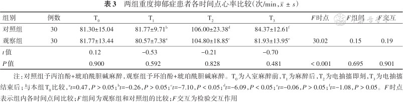 选择山西医科大学第一医院精神科2022年11月至2023年3月应用MECT治疗的重度抑郁症患者60例,年龄范围18~60岁,美国麻醉医师协会(ASA)分级Ⅰ~Ⅱ级的患者60例,男31例,女29例,身体质量指数(BMI)为18~30 kg/m2,病程3个月至5年。该研究为前瞻性研究,采用随机数字表法分为观察组(环泊酚+琥珀酰胆碱麻醉)和对照组(丙泊酚+琥珀酰胆碱麻醉)。比较两组入室麻醉前(T0)、麻醉后(T1)、电抽搐即刻(T2)、电抽搐结束后(T3)的生命体征,包括心率(HR)、平均动脉压(MAP)、血氧饱和度(SpO2)等。记录两组的呼吸恢复时间(静脉注射完琥珀酰胆碱至自主呼吸开始恢复的时间)和意识恢复时间(静注完环泊酚/丙泊酚至意识开始恢复的时间)、麻醉药物追加情况、血管活性药物应用情况、不良反应发生情况。