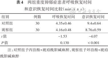两组重度抑郁症患者呼吸恢复时间和意识恢复时间比较(min,)