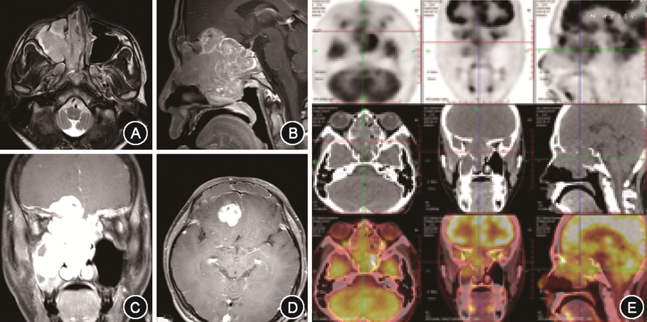 | 侵犯范围 | 鼻腔鼻窦、视神经、海绵窦、颅底骨质、额颞叶 | 左侧鼻腔、左侧上颌窦、左侧鼻翼皮下 | 右侧鼻腔、筛窦、鼻腔顶壁、外侧壁及下鼻甲、蝶骨蝶窦前下壁、颈部淋巴结 | 右鼻腔、额窦、筛窦、上颌窦、蝶窦、前中颅底、颅内、中下鼻甲、鼻中隔、鸡冠、眼眶内壁、内直肌、视神经、翼腭窝、枕骨斜坡、额叶、周围多发骨质 | 颅内、颈部淋巴结 |