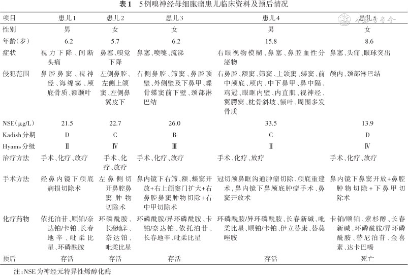 5例嗅神经母细胞瘤患儿临床资料及预后情况