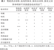鹦鹉热常会出现肺部浸润性病变,应与病毒性肺炎、肺炎支原体肺炎和细菌性肺炎等其他病原体肺炎进行鉴别诊断(表3)。