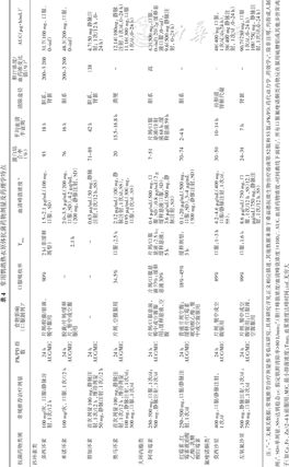 | 抗菌药物类别 | 常规推荐治疗剂量 | PK/PD 指数 | 食物影响 (口服制剂)a | 口服吸收率 | Tmax | 血清峰值浓度 b | 蛋白结合率(%) | 平均血清半衰期c | 清除途径 | 胆汁浓度/血药浓度比值(%)d | AUC(μg·h/mL)e |