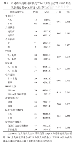 不同临床病理特征接受TCbHP方案治疗的HER2阳性乳腺癌患者tpCR情况比较[例(%)]