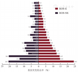 337例MDS-E患者进行了二代测序检测,基因突变图谱见图1。其中检出率较高的依次为U2AF1(82例,24.3%)、TP53(50例,14.8%)、ASXL1(49例,14.5%)、SF3B1(40例,11.9%)、RUNX1(33例,9.8%)、DNMT3A(31例,9.2%)、TET2(27例,8.0%)和BCOR(25例,7.4%)。与MDS-NE患者相比,MDS-E患者多打击TP53[42例(12.5%)对78例(7.1%),P=0.002]、BCOR[25例(7.4%)对41例(3.7%),P=0.005]、STAG2[15例(4.5%)对26例(2.4%),P=0.044]基因突变检出率显著增高,ASXL1[49例(14.5%)对225例(20.5%),P=0.015]、SRSF2[8例(2.4%)对64例(5.8%),P=0.011]、ZRSR2[1例(0.3%)对34例(3.1%),P=0.004]基因突变检出率显著减低(图2)。