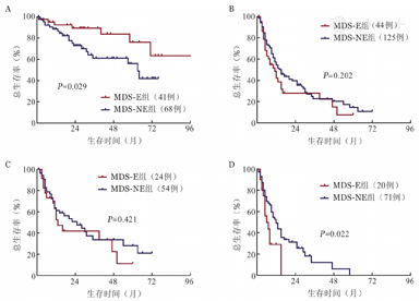 在全部患者中,MDS-E与MDS-NE两组患者中位OS时间分别为未达到和49(95%CI 33~57)个月(P=0.064)。进一步行亚组分析:MDS-RS患者中,MDS-E中位OS时间显著长于MDS-NE患者[未达到对63(95%CI 53~73)个月,P=0.029](图3A)。而伴TP53突变的MDS中,MDS-E与MDS-NE患者中位OS时间差异无统计学意义[11(95%CI 7~15)个月对15(95%CI 11~19)个月,P=0.202](图3B)。LB且伴TP53突变患者中,MDS-E与MDS-NE相比中位OS时间差异无统计学意义[13(95%CI 8~18)个月对25(95%CI 11~39)个月,P=0.421](图3C),但在IB且伴TP53突变患者中,MDS-E患者中位OS时间为6(95%CI 2~10)个月,明显短于MDS-NE患者的12(95%CI 9~15)个月(P=0.022)(图3D)。而在IB且不伴TP53突变的MDS患者中比较MDS-E和MDS-NE两组的中位OS时间差异无统计学意义[27(95%CI 6~48)个月对26(95%CI 21~31)个月,P=0.545]。