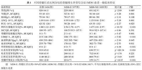 | 临床特征 | 全部(1436例) | MDS-E(337例) | MDS-NE(1099例) | 统计量 | P值 |