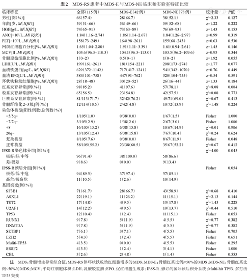 | 临床特征 | 全部(115例) | MDS-E(42例) | MDS-NE(73例) | 统计量 | P值 |