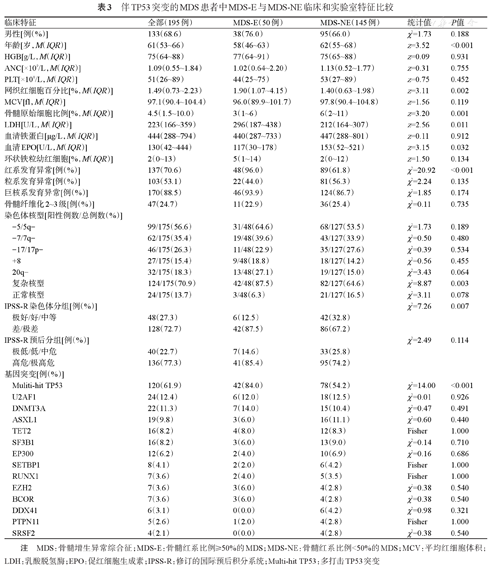 注 MDS:骨髓增生异常综合征;MDS-E:骨髓红系比例≥50%的MDS;MDS-NE:骨髓红系比例<50%的MDS;MCV:平均红细胞体积;LDH:乳酸脱氢酶;EPO:促红细胞生成素;IPSS-R:修订的国际预后积分系统;Multi-hit TP53:多打击TP53突变