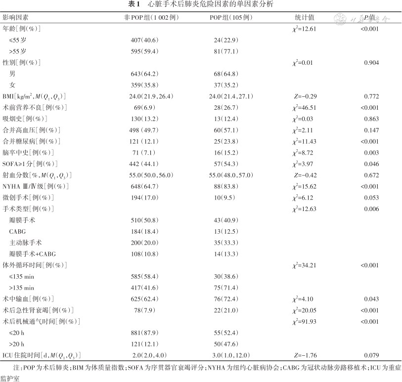 回顾性队列研究。纳入2020年11月—2021年10月南京鼓楼医院心胸外科行心脏手术的1 107例患者的临床资料,其中男711、女396,年龄32~77[59(51,68)]岁。根据患者是否发生POP分为2组:POP组105,非POP组1 002例。观察指标:(1)分析心脏手术后患者POP的发病情况,比较2组患者的病死率。(2)纳入年龄、性别、体质量指数、术前营养不良、吸烟史、脑卒中史、合并高血压、合并糖尿病、序贯器官衰竭评分(SOFA)≥1分、射血分数、纽约心脏病协会(NYHA)分级Ⅲ/Ⅳ级、是否微创手术、手术类型(包括瓣膜手术、冠状动脉旁路移植术、主动脉手术及瓣膜手术联合冠状动脉旁路移植术)、体外循环时间、术中输血、术后机械通气时间、术后有无急性肾衰竭、重症监护室住院时间等因素,应用logistic回归分析筛选心脏外科手术患者POP的独立危险因素。