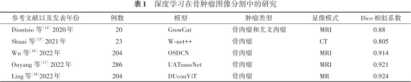 图像分割目前仍然是肿瘤学临床实践中的一个重要组成部分,表1是近些年深度学习模型在骨肿瘤图像分割领域应用的研究进展。在不同时间点利用深度学习模型从基线开始跟踪病变,有效地监测体积变化,并在治疗前、治疗期间和治疗后进行定量分析,以评估治疗反应,还可以帮助预测预后终点。然而由于深度学习技术尚未广泛应用于临床并替代人工,目前的共识是通过计算机模型辅助边缘检测,然后在此基础上进行手动分割,可以实现最佳的分割。深度学习在骨肿瘤图像的处理效率方面具有优势,但其对骨肿瘤图像识别的准确度有待进一步提高,对于较小的骨肿瘤区域,自动分割方法需要大量数据进行模型优化。U-Net与Transformer的结合与不断改进,是近年来的研究热点。