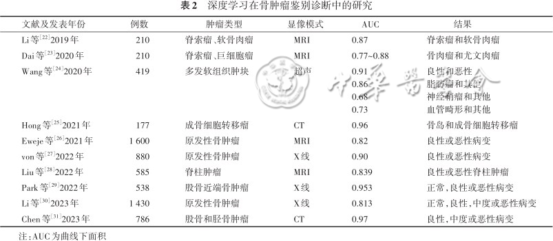 近期有研究显示,Liu等[21]开发了一种深度学习和机器学习融合模型,不仅基于常规X射线平片,还结合了一些潜在相关的临床数据,包括血沉率、年龄、性别、位置、红肿充血、肿胀、发热、疼痛、可触摸的肿块和运动障碍,将肿瘤分为良性、恶性或中度肿瘤。该研究共纳入了643例患者的982张X射线平片,在测试集中,融合模型在二元分类任务包括良性/非良性、恶性/非恶性、中等/非中等的AUC为0.865~0.898,在三分类任务中平均AUC为0.872,放射科医师的平均AUC为0.819。深度学习模型在一定程度上可以帮助放射科医师进行骨肿瘤的鉴别诊断,相关研究见表2。既往研究表明,在影像学图像的基础上加入更多临床信息的模型,其表现优于单独图像深度学习模型,表明结合临床信息对模型的性能有一定的提高作用。随着图像处理技术的发展,将会有更多信息加入到深度学习模型中,使研究者们能够设计精确度更高的分割方法,这也是改良深度学习模型的一个方向,充分挖掘深度学习模型的潜力,发挥医工结合优势。