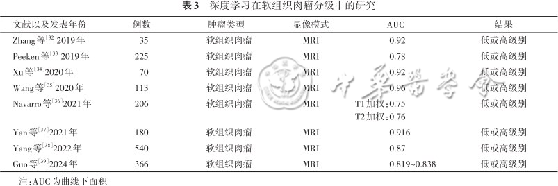 3. 肿瘤分级与分期:在肿瘤患者中,最佳治疗方式很大程度上取决于瘤体的大小、位置和侵袭性的测量评估,称为肿瘤分级。在目前的临床工作中,为了确定肿瘤分级,治疗前需要进行侵入性活检。近年来已有研究在小到中等数量数据集上利用影像学图像预测患者的肿瘤分级(表3),将肉瘤等级分为高等级和低等级可以一定程度上帮助医师制定诊疗计划,减少有创检查,并提高对预后的预测准确性。研究结果表明,影像组学与深度学习结合可以辅助骨肉瘤分级,具有辅助医师针对性地选择不同治疗方案的潜力。目前肌骨系统肿瘤的深度学习模型分级局限于软组织肉瘤领域,虽然在原发性骨肿瘤中还没有类似的研究,但这可能是潜在的研究方向。使用更大的数据集对于提高模型的重现性和可推广性或许是一个较好的突破点,另外,如果可以将肿瘤的分级更加细化,能带给临床医师更多的指导作用。